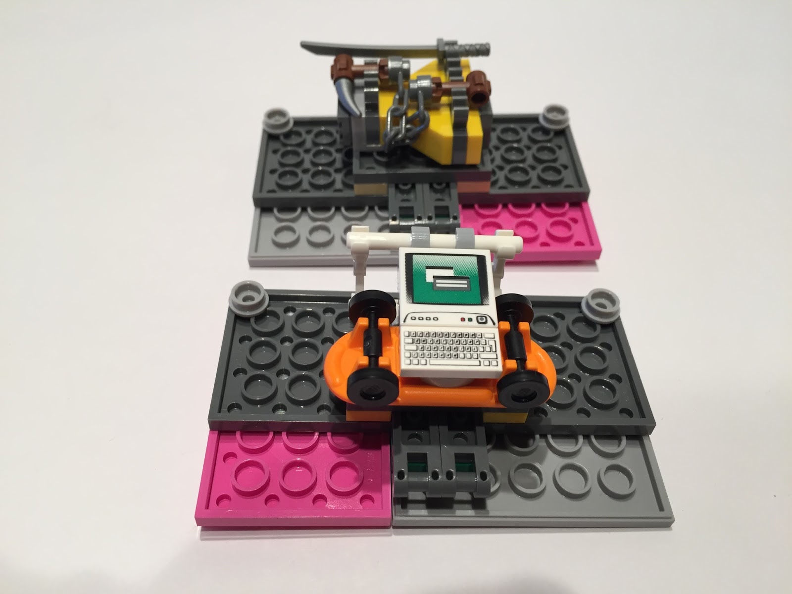 I have one train car for now. Kinda... 79104 The Shellraiser Street Chase came with the necessary hardware to travel on the tracks. However, I had to strip a number of pieces to ensure it'd fit. The wheels, cannon, and side doors all had to be taken off so the car can fit under the walkway bridge and in the corridor between the two platforms.